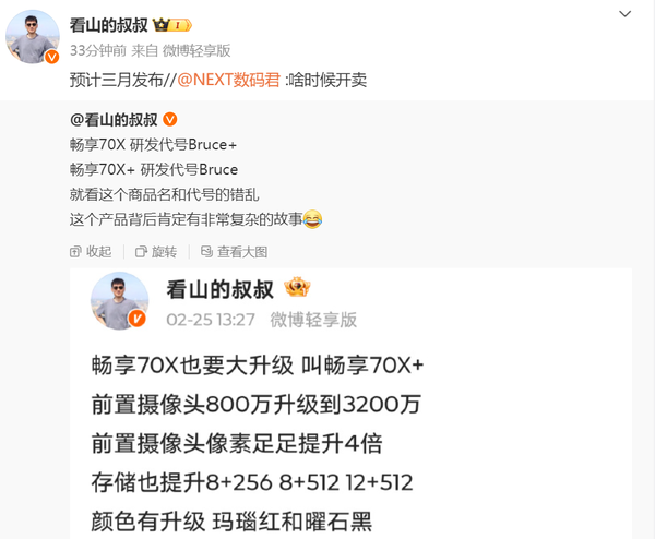 [CNMO科技消息]2月26日晚,一位博主曝光了华为即将发布的新机型——畅享70X+。据悉,该机型的研发代号为“Bruce”,预计将于3月正式面世。相较于前代,畅享70X+在多个方面进行了显著升级。